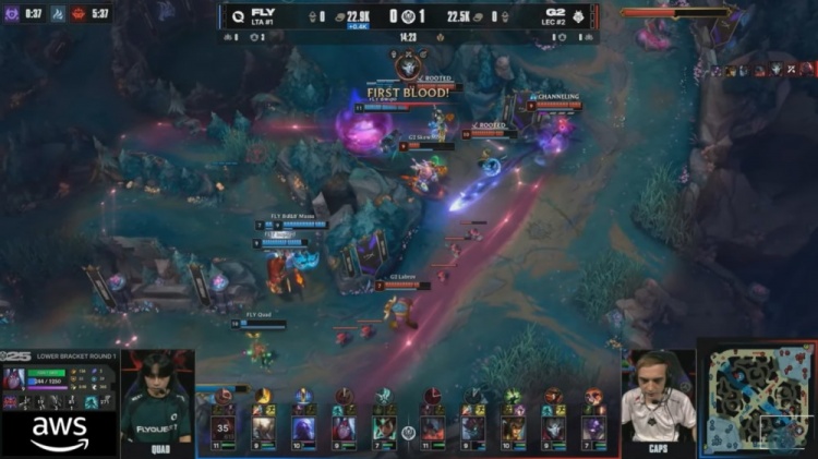 第一局前期双方稳定发育,Caps蛇女下路找Bwipo赛恩单挑却被塔下反杀,FLY随后上路三人越塔击杀BB剑魔打开局面。