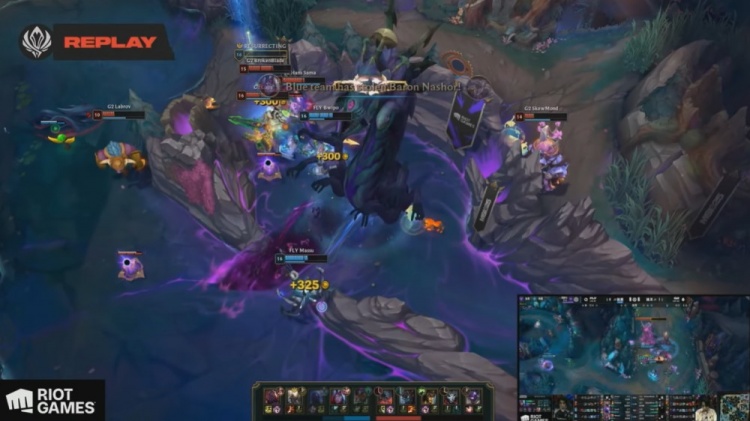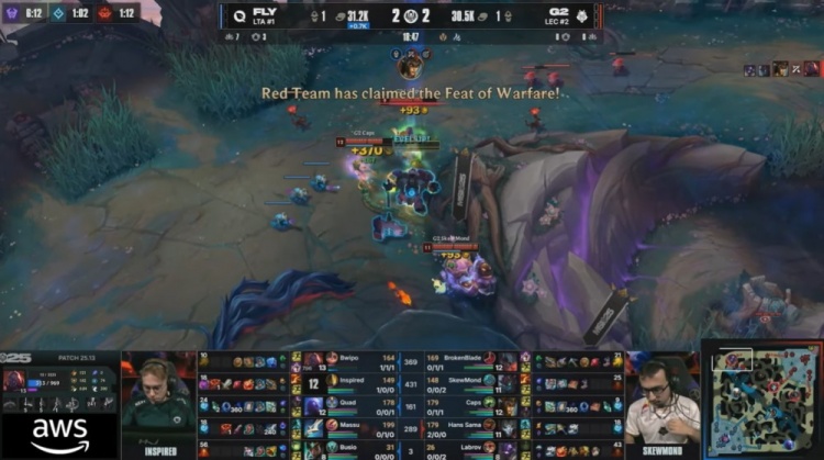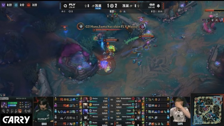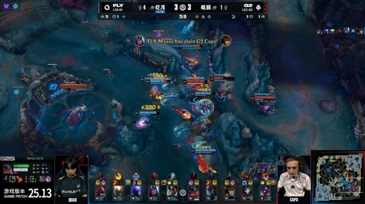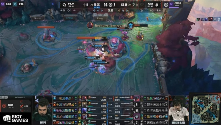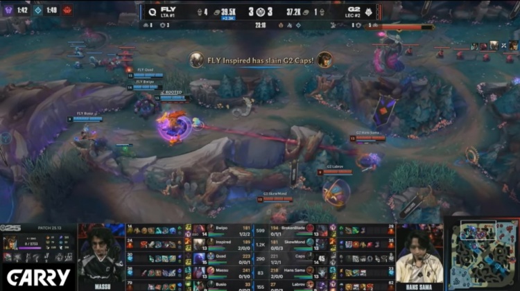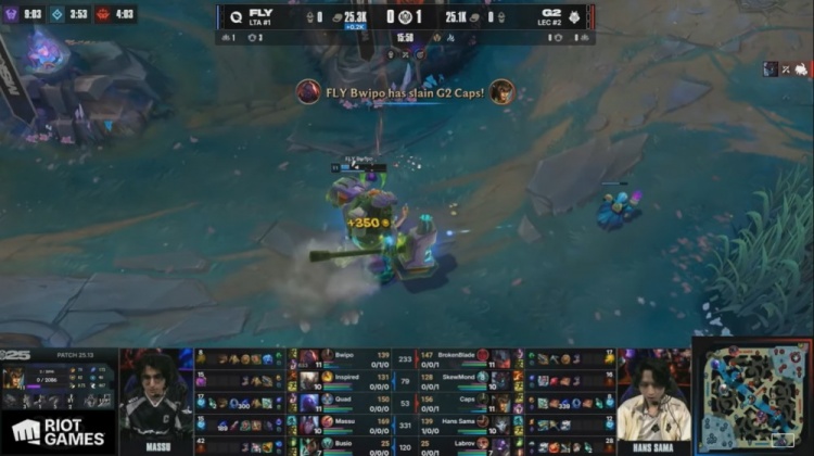 中期,Bwipo赛恩配合先锋拆掉中路二塔,经济取得领先。Inspired潘森多次跳大带动团战节奏,击杀Caps后带队控下厄塔汗和小龙,FLY逐渐扩大优势。后续Massu韦鲁斯抢下大龙,FLY经济领先达到6k。