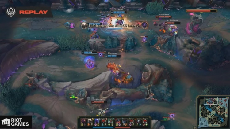 【18:38】上路Bwipo赛恩带线也被G2三人逮捕,Caps蛇女打出征服者拿到人头。小龙团,FLY放出先锋开车撞人,SkewMond茂凯吃掉小龙,河道混战,Bwipo赛恩残血后撤,双方残血拉开,中路Bwipo配合先锋转拆掉G2二塔,FLY经济领先1.5k。