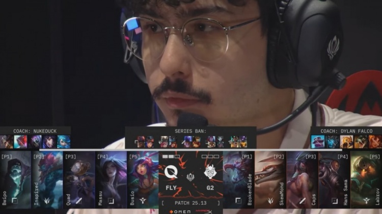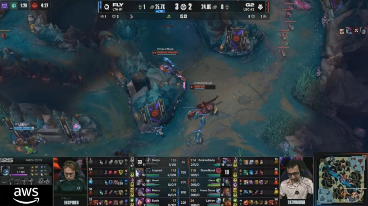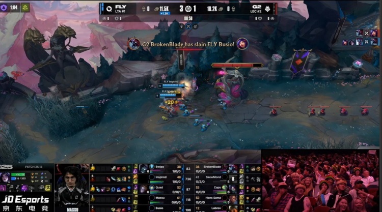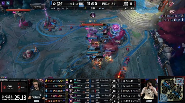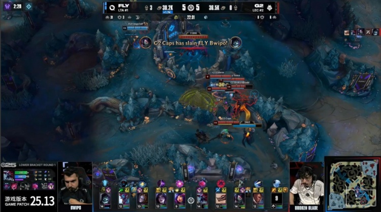 中期G2下路发起进攻,Caps阿卡丽支援失败,Labrov泰坦被FLY集火击杀,双方辅助互换,FLY偷掉厄塔汗扩大经济优势。