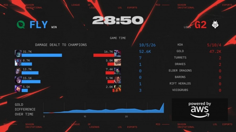 后期G2在小龙团中集火击杀Bwipo掘墓,Caps阿卡丽拿到赏金人头,G2控下小龙缩小差距。但FLY中路一波强势推进,Massu卡莎击杀Hans Sama卢锡安终结比赛,FLY打出0换4推平G2基地,赢得比赛胜利。
