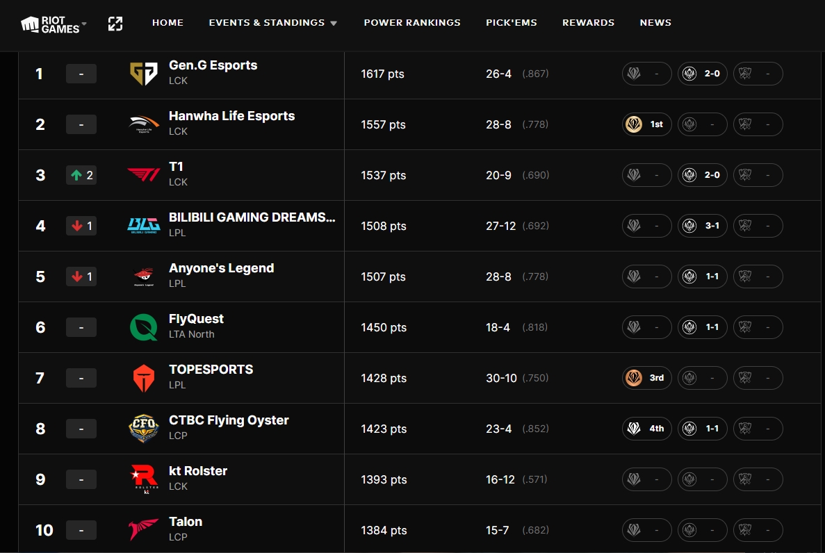 直播吧7月7日讯 2025MSI淘汰赛胜者组、败者组首轮比赛结束,赛后LOL赛事官网全球战队战力榜更新,LCK包揽前三,BLG位列第四、AL第五、TES第七、CFO第八。