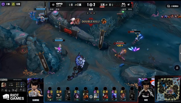 【0:40】河道团3V3,但是Kaiwing泰坦钩空之后闪现+点燃A击杀kael妮蔻拿下一血!但是没人管的Hope卢锡安配合队友追击双杀!AL的1换2!