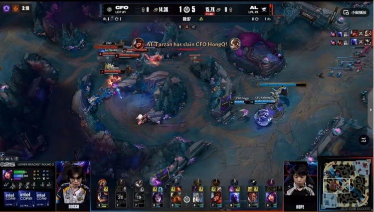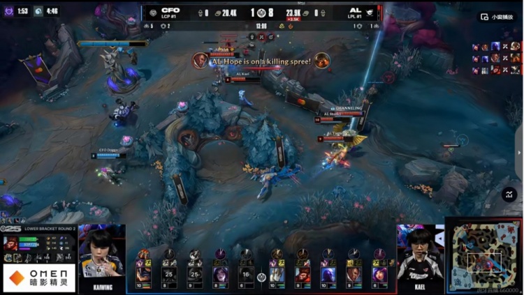 【16:58】AL拿下先锋!团战Hope卢锡安直接大招起手拉满伤害!AL追击被Junjia斯卡纳顶+钳两个但是伤害确实差一点啊!这波最终是AL打出1换2,随后直接用先锋撞掉了CFO的中一塔!