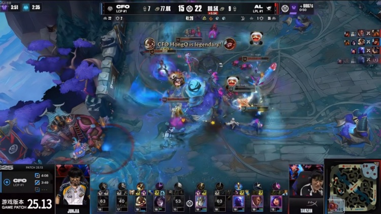 【26:50】AL大龙逼团,Tarzan猴子先手但是被Junjia斯卡纳钳了三个!Driver兰博大招AOE拉的满中满!AL中野瞬间没了!残局五打二的CFO没给机会!直接打了个0换5团灭+拿下大龙!CFO直接从落后7K变成领先1K!