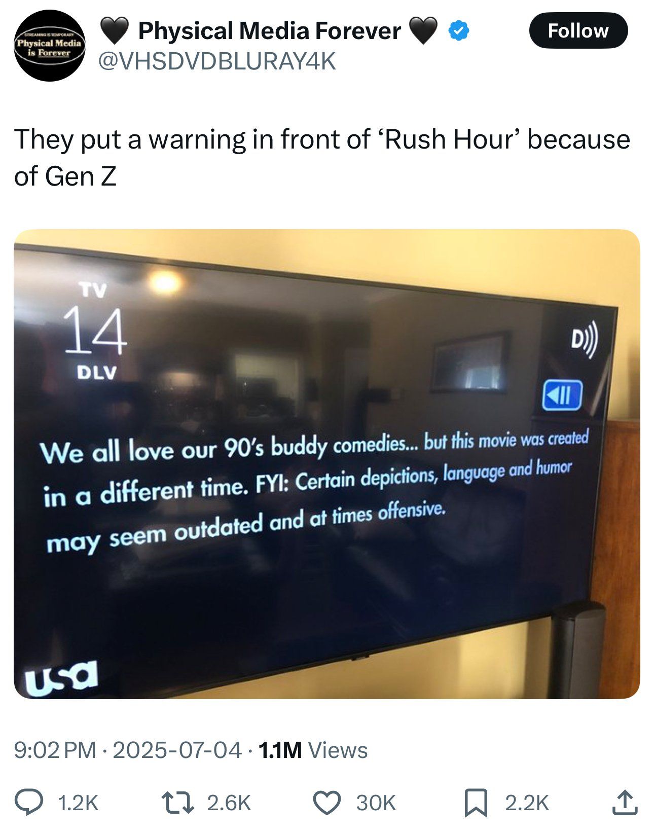 在“内容警告”中,官方表示“我们都喜欢兄弟喜剧……但(《尖峰时刻》)诞生于不同的时代,请注意,某些描述、语言、幽默可能显得过时,甚至令人反感。”