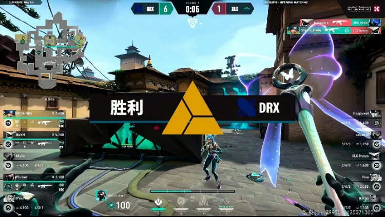 第七局:XLG想要强行进C,但是DRX直接多人回防在点内落位,霓虹直接点内游龙三杀,DRX拿下胜利!