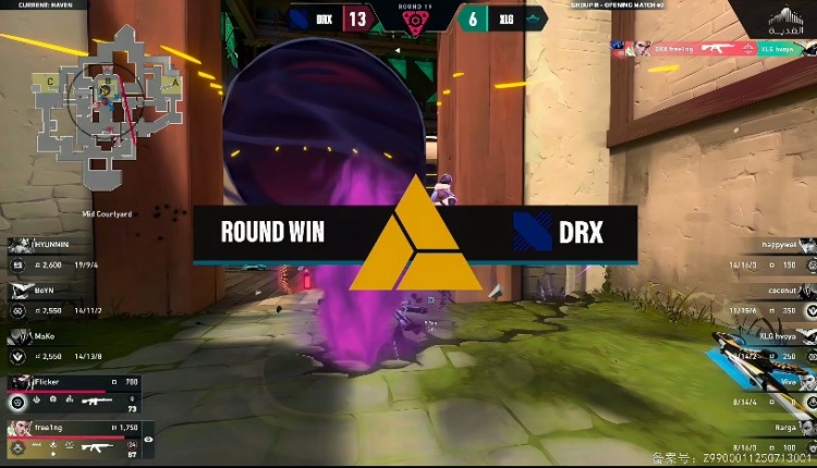 第十九局:DRX提速进到A点,虽然A小DRX被收下一人,但是DRX还是抢下A点,随后DRX在点内和XLG交火,DRX收下XLG五人拿下胜利!