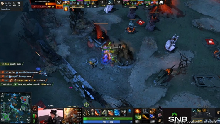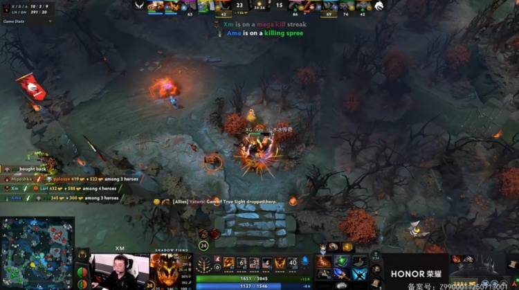 【22:18】XG五人开雾下路找人保护Ame开肉山,Spirit姗姗来迟但Larl火猫抢掉不朽之守护,Xm影魔先杀rue海民,Xxs卖掉自己,双方打出1换1。