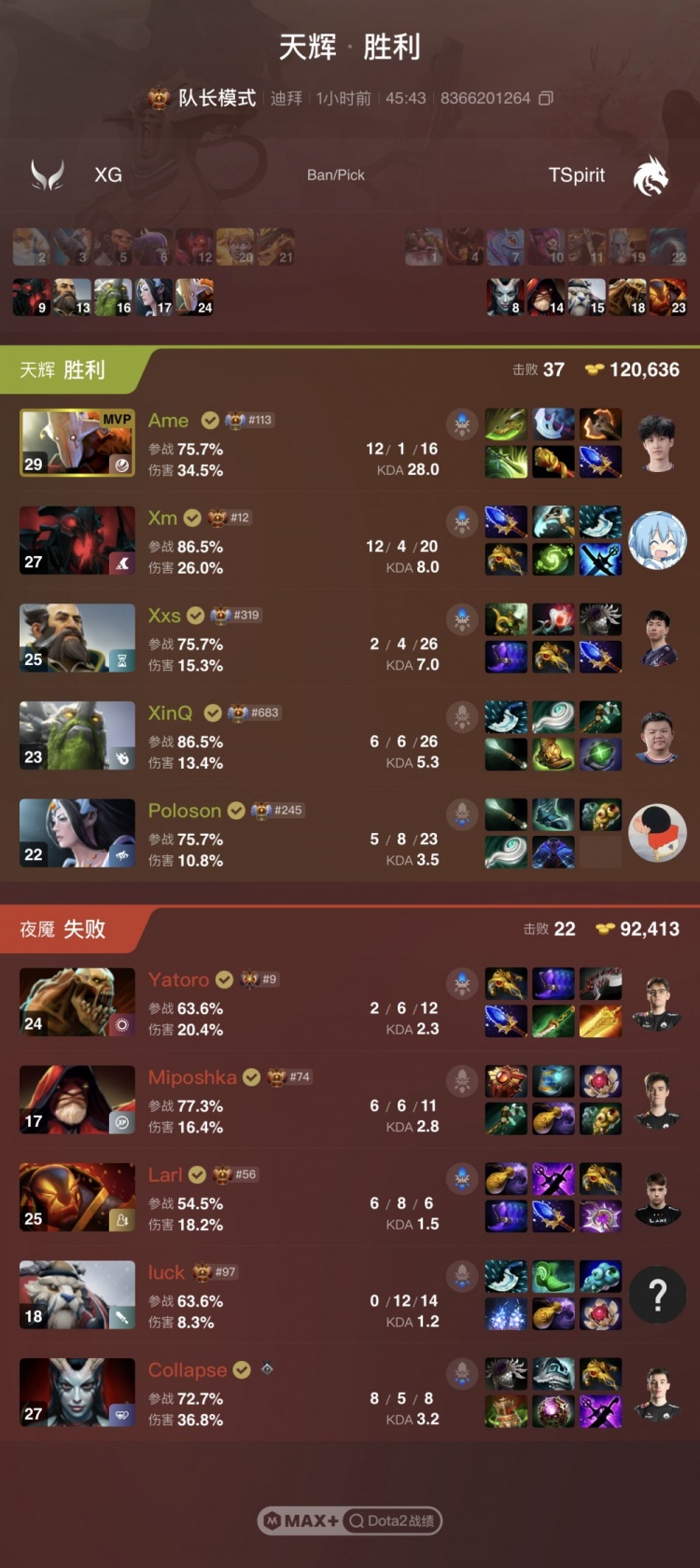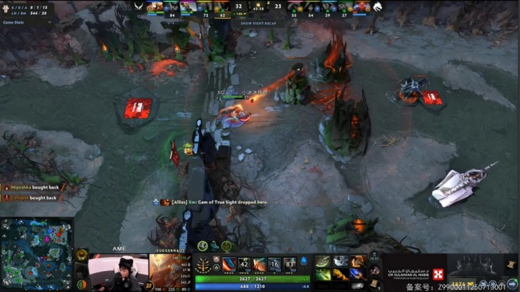 后期XG连续推进拔掉Spirit三路高地。Spirit五人开雾反扑,Collapse女王被羊买活再死,XG稳住正面战场节奏,Spirit敲出GG,双方战成平手。