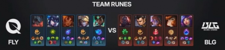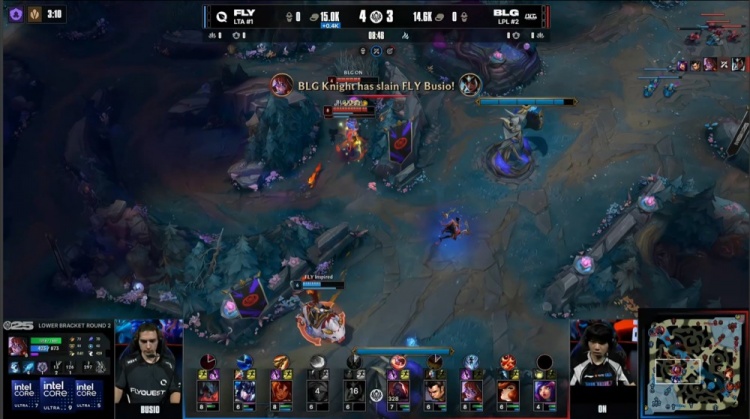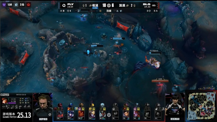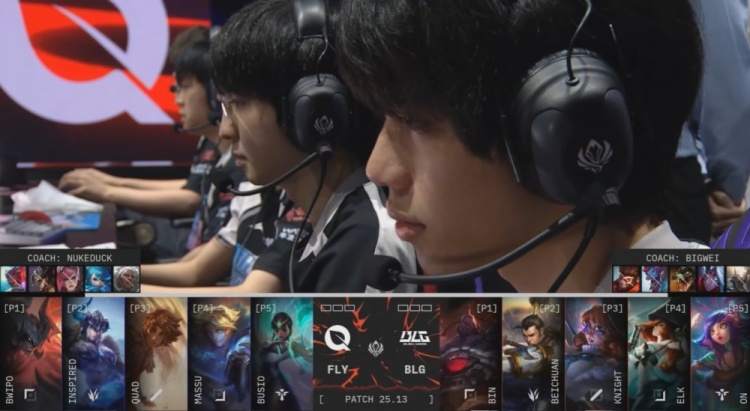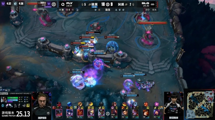 中期knight阿萝拉与ON妮蔻先后通过联动打出击杀帮助BLG追平局势。随后FLY依靠Bwipo剑魔的正面压制与Quad岩雀的控制,在团战中连续打出优势,先后拿下小龙与厄塔汗,逐渐将经济优势扩大。后续ON妮蔻试图先手开团未果,Bwipo剑魔与Inspired猪妹反打完成收割,FLY团战占优并掌控大龙资源。