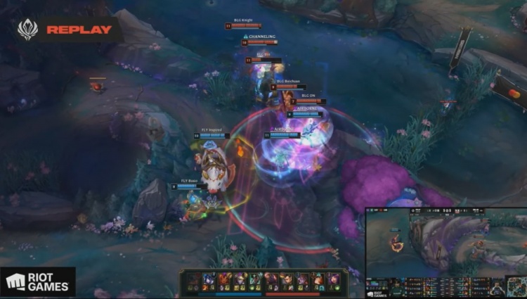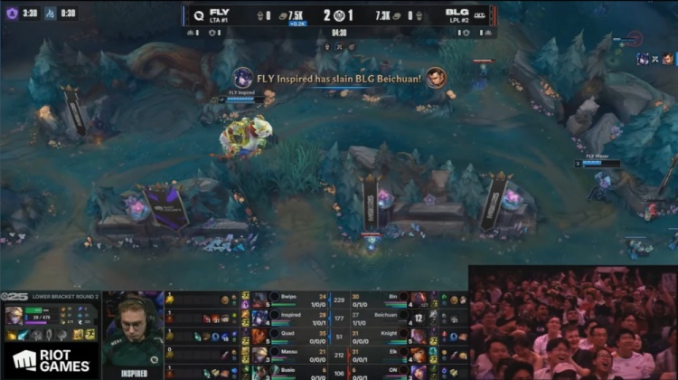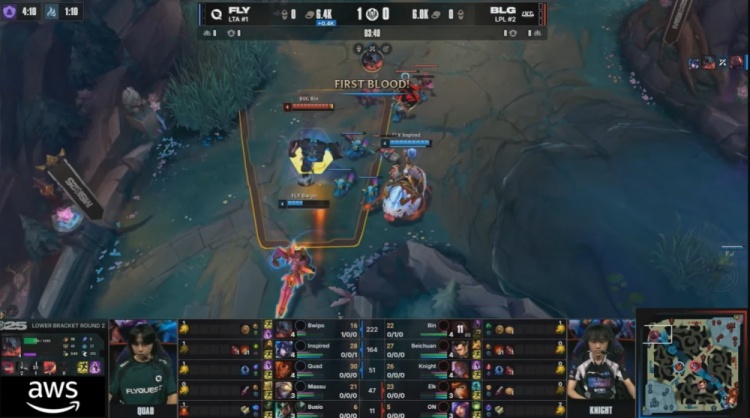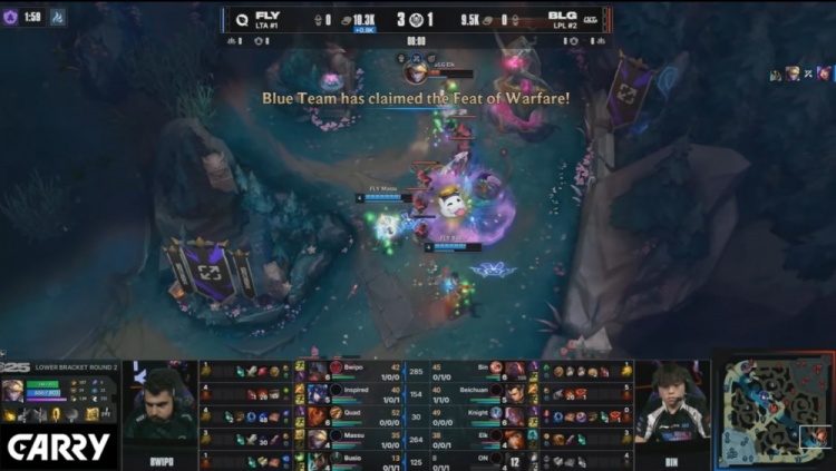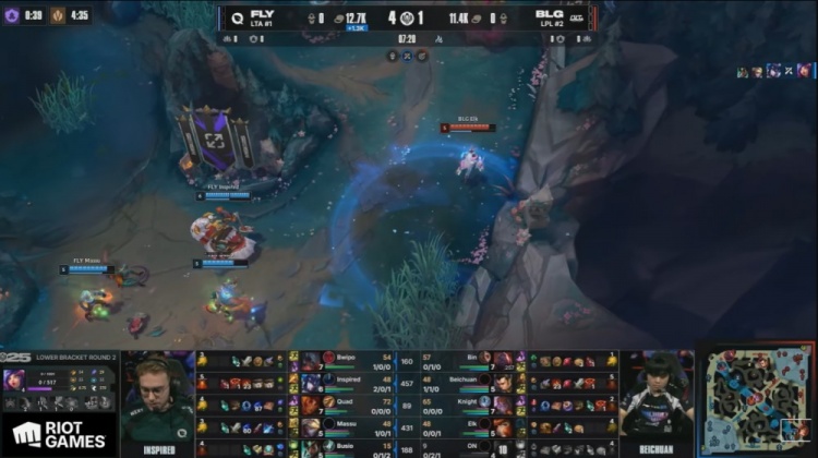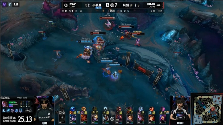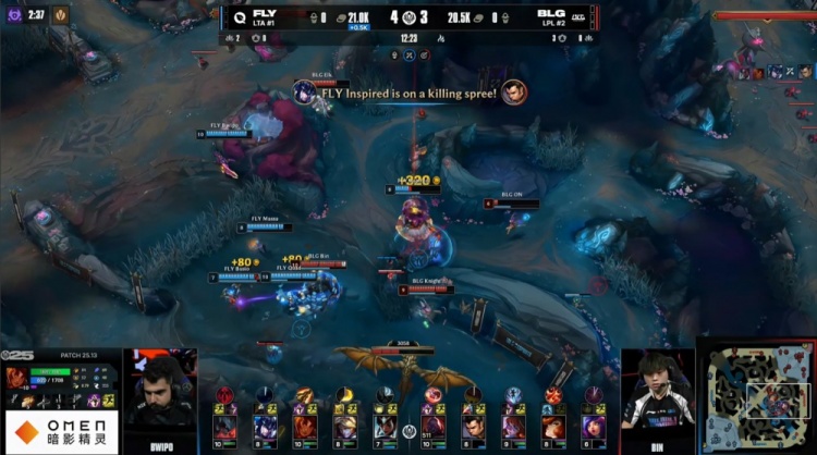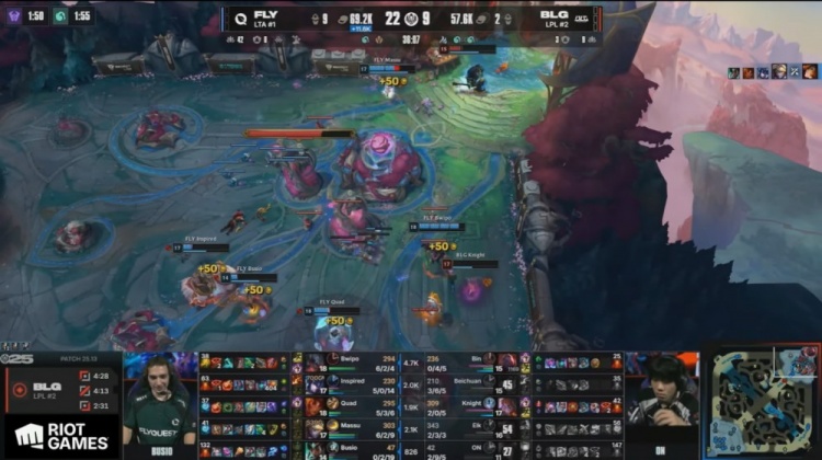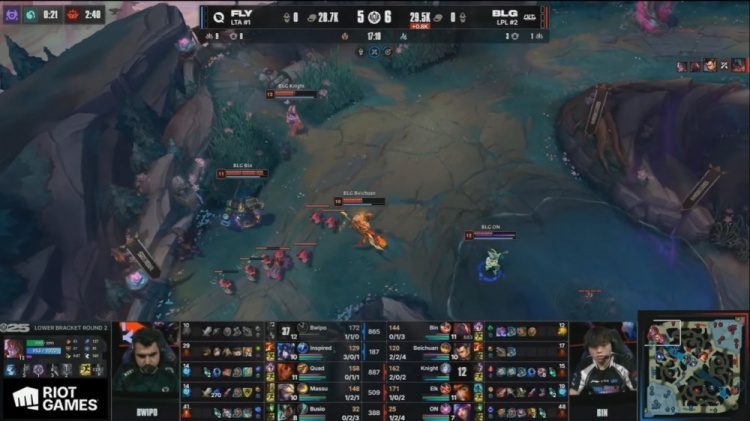 【22:25】河道团战,Bwipo剑魔TP正面开砍,随后Quad岩雀抬飞BLG两人,Massu点掉Elk,BLG上辅瞬间阵亡,FLY打出0换3吃掉厄塔汗,Inspired小猪甩狙击中复活的ON再拿一个人头,FLY经济领先3k。