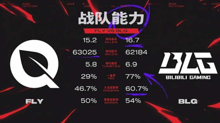 直播吧7月9日讯 2025MSI淘汰赛BLG对阵FLY赛前,官方放出了数据前瞻,BLG一血率遥遥领先,在场均击杀、场均推塔和中立资源控制率数据上小幅领先。BWIPO分均伤害、分均经济更高,但Bin战损比、场均补刀小幅领先。