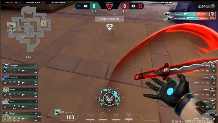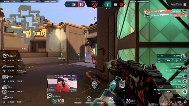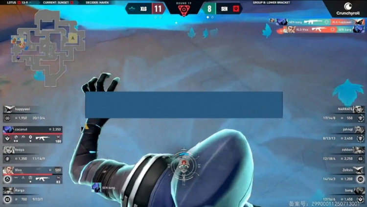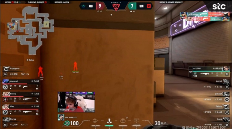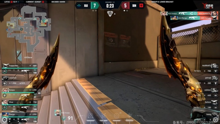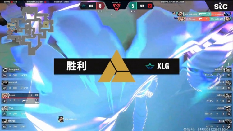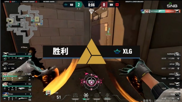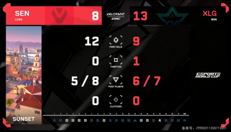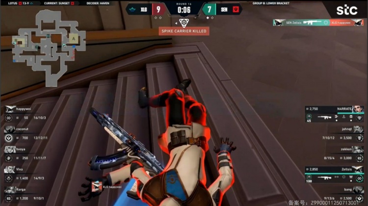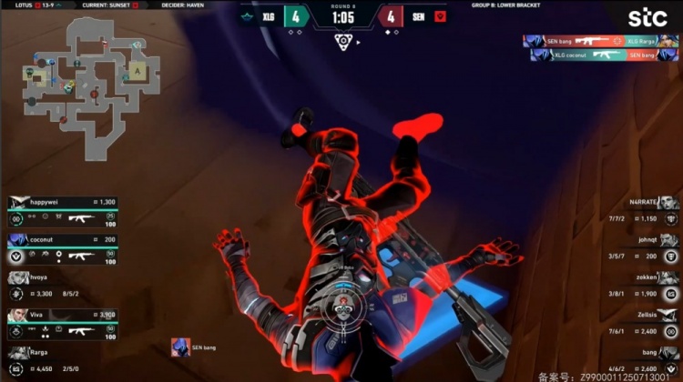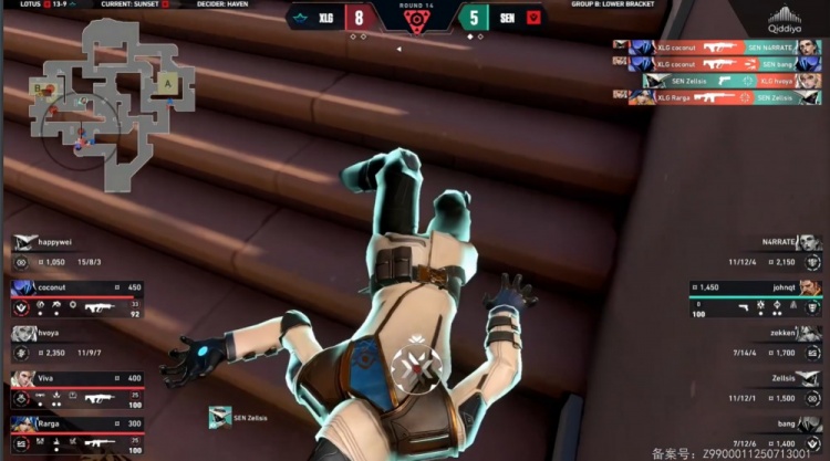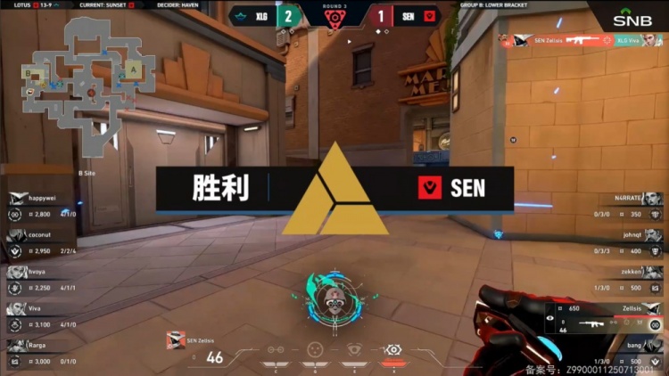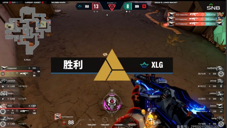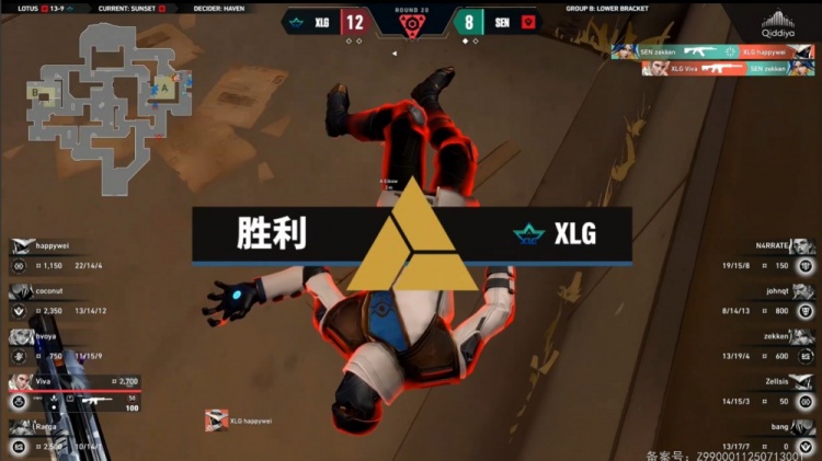 第20局XLG继续冲A,N4RRATE前点换掉XLG三人,viva于happywei摸进A点清掉SEN两人,XLG顺利在A下包,残局2v2,happywei一枪带走Zellsis,zekken被viva补掉,XLG12-8SEN。