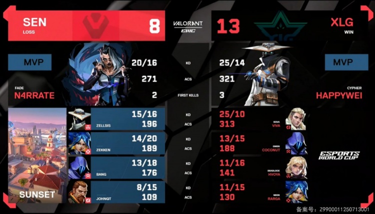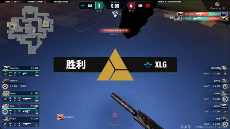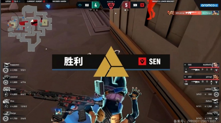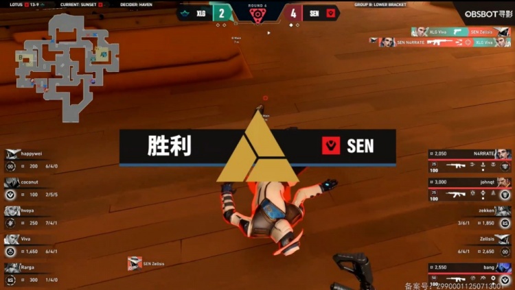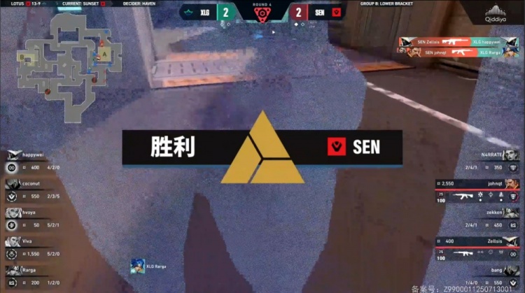 第4局SEN继续冲A,zekken击杀hvoya,双方混战SEN打出2换3,SEN在A下包,Rarga无甲大狙一发带走N4RRATE后被反杀,XLG2-2SEN。