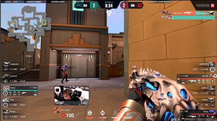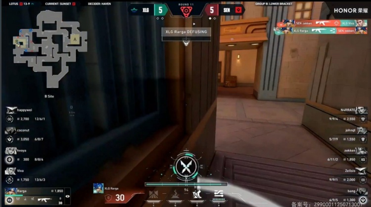 图二日落之城上半场SEN多次从中路发动进攻,主打B点和A点突袭,Zellsis和zekken多次打出关键击杀,一度反超比分。但XLG整体防守稳健,尤其是viva和happywei多次完成多杀,成功稳住局面。临近半场结束,Rarga与hvoya连续关键操作帮助XLG反超比分,XLG最终以7-5领先结束上半场。