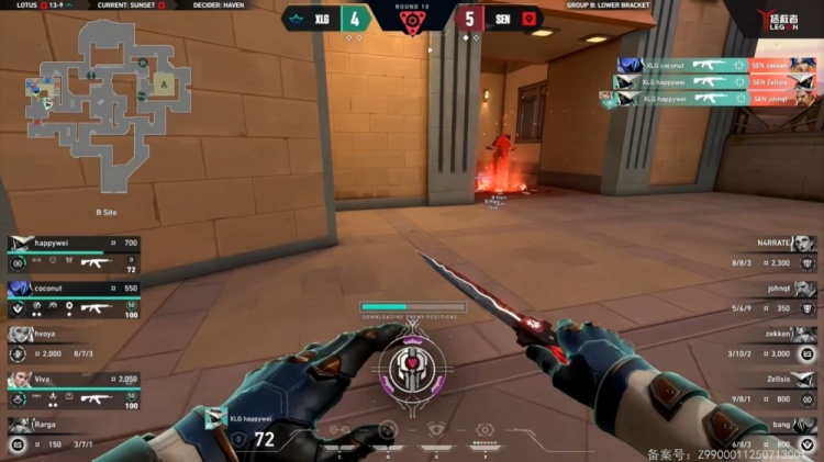 第19局zekken大狙在B前点直架,XLG强冲B点,包点XLG2换4后下包,残局bang1v3无力回天,XLG11-8SEN。