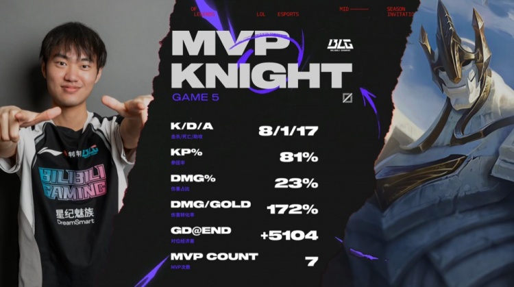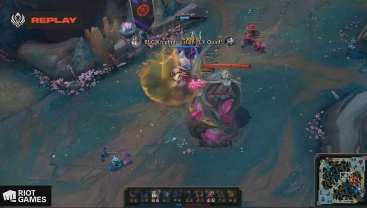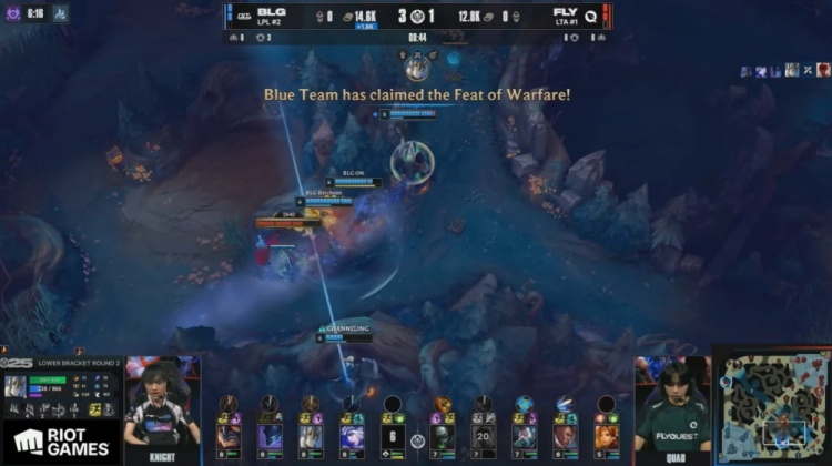 【22:10】knight加里奥中路被Bwipo厄加特拉住送出大人头,BLG四人中路推进轻松融化FLY中上辅三人,BLG回头吃掉小龙听牌炼金龙魂,经济领先1w。