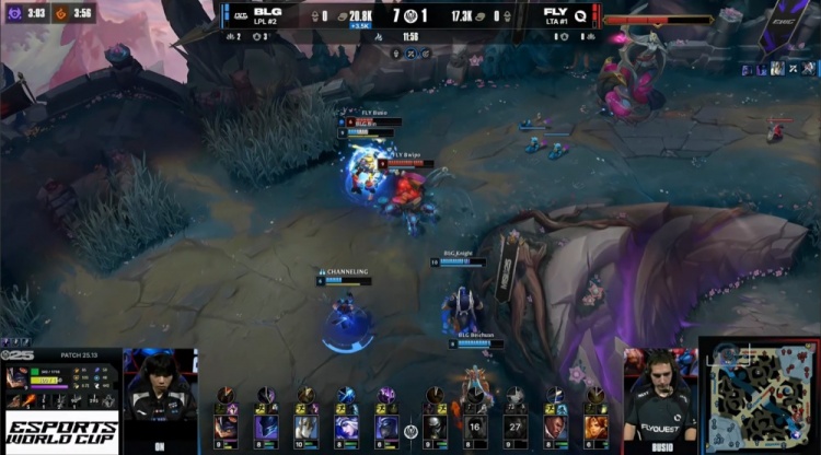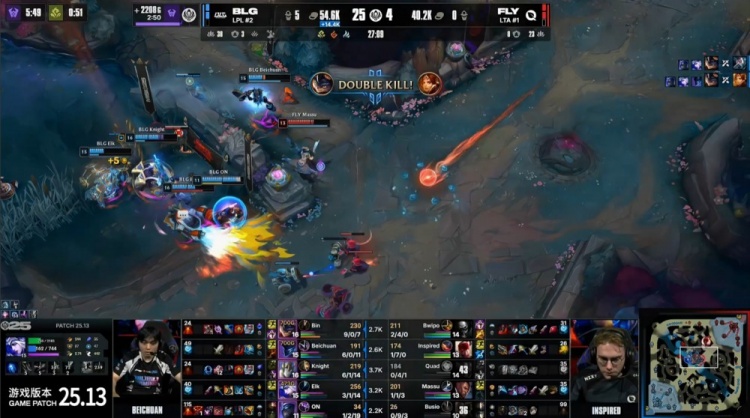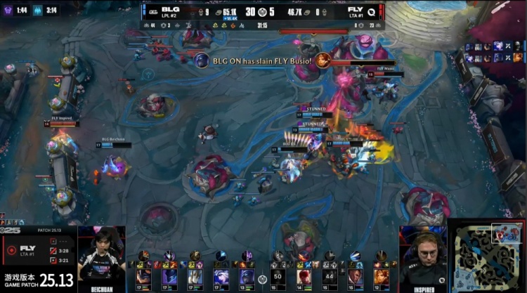 【25:20】中路团战,Busio女坦吃基兰大招起身但还是被阿Bin融化,BLG中路推进,Inspired盲僧再送一个,beichuan击杀FLY上野拿到双杀,BLG打出0换3推掉FLY高地塔,经济领先1w2k。