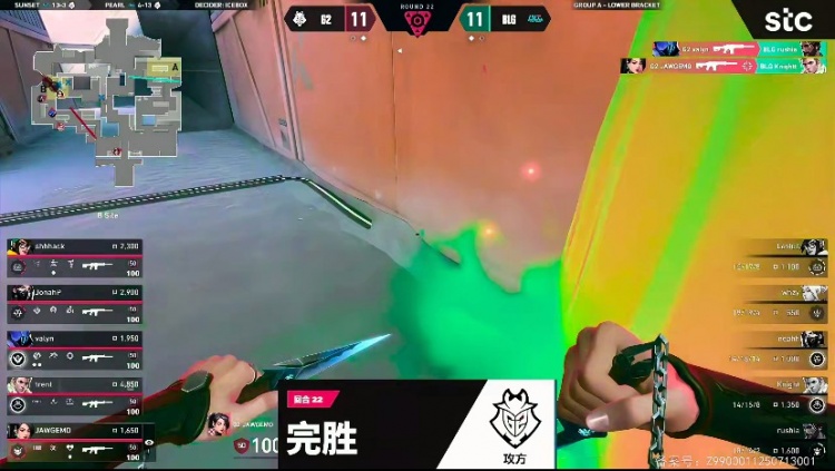 第二十二局:G2开局选择进攻A点,BLG在B点一人被压退,但是BLG在A点四人重防成功接住G2的进攻,BLG成功拿下胜利!
