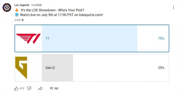 LOL官方油管赛前投票:75%看好T1获胜,仅25%看好GEN