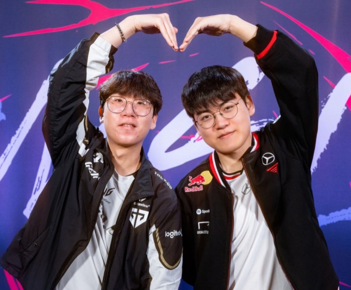 直播吧7月10日讯 2025MSI胜者组GEN vs T1赛前,LOL官方发布两队下路Ruler和Gumayusi比心合照。