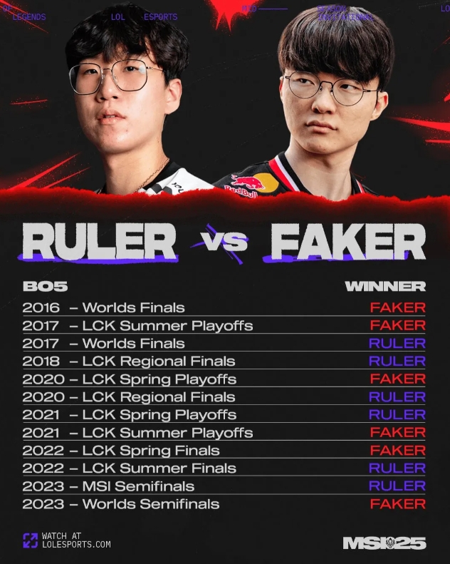 BO5大场胜负持平!LOL官推晒Faker与Ruler过往交手记录:传奇间的对决新篇章