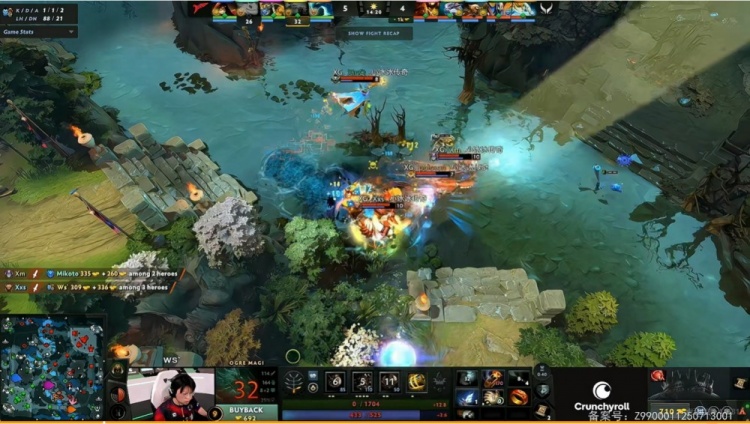 【18分钟】XG开打肉山,Xxs人马顶在前面,第二波XG四人开雾绕后,直接先手打残蓝胖!poloson小娜迦开大配合到了Ame影魔摇大,直接贴脸秒掉了23savage水人!这波XG打出0换3,拿下肉山让Ame影魔控盾,随后再拿20分钟的魔晶!一波拉开了7K经济差!
