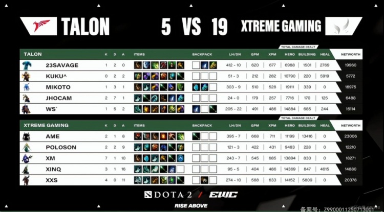 首局比赛XG选到了小娜迦+影魔的一五号位组合,虽然线上Jhocam小Y开局双杀,但是Talon拿到五个击杀之后就被锁住,XG一波野区团娜迦影魔完美配合秒掉23savage水人断了节奏,随后持续压制控下两代肉山!团战端Xm大鱼+Xxs人马双踩连续秒掉TALON酱油,XG高地团团灭TALON,轻松赢下首局比赛!