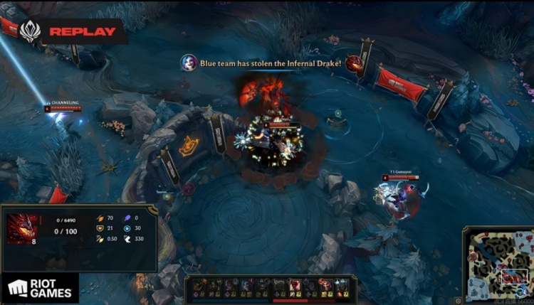 【11:18】Oner盲僧绕后gank,Q+大招配合Doran安蓓萨大招直接越塔干净利落强杀Kiin鳄鱼!T1拆掉上一塔!经济优势快3K了!但是小龙被Ruler金克丝大招抢走了!本局水龙魂!