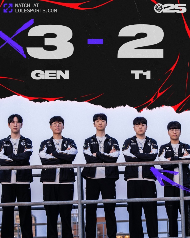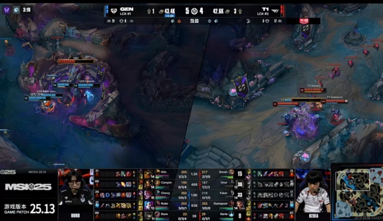 直播吧7月10日讯 2025年MSI季中赛来到淘汰赛阶段,今天将要进行的是胜者组决赛,也是一场LCK内战:GEN对阵T1!本场BO5比赛中GEN连续两次领先,但是T1依靠韧性+上野的发挥连续两次扳平了比分将比赛拖入决胜局,决胜局GEN在劣势局面下Ruler金克丝抢龙+团战输出拉满帮助团队完成逆转,率先晋级到本届MSI的最终决赛!
