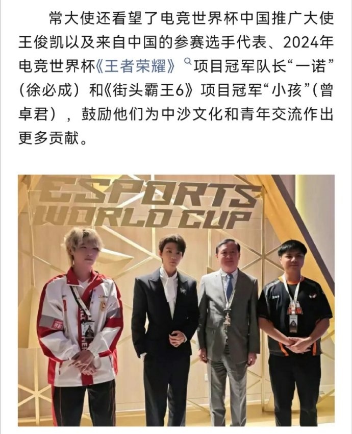 直播吧7月11日讯 2024年电竞世界杯《王者荣耀》项目冠军队长“一诺”(徐必成)出席电竞世界杯开幕式;并与驻沙特大使常华电竞世界杯中国推广大使王俊凯以及来自中国的参赛选手代表、和《街头霸王6》项目冠军“小孩”(曾卓君)合影。