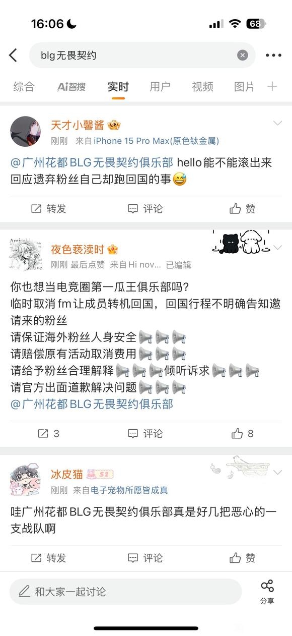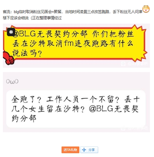 直播吧7月11日讯 沙特电竞世界杯无畏契约项目中BLG不敌KC后惨遭淘汰,赛后有粉丝在贴吧爆料称BLG官方临时取消了粉丝见面会和聚餐,当地时间凌晨三点改签跑路,丢下粉丝团在沙特无人问津。