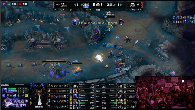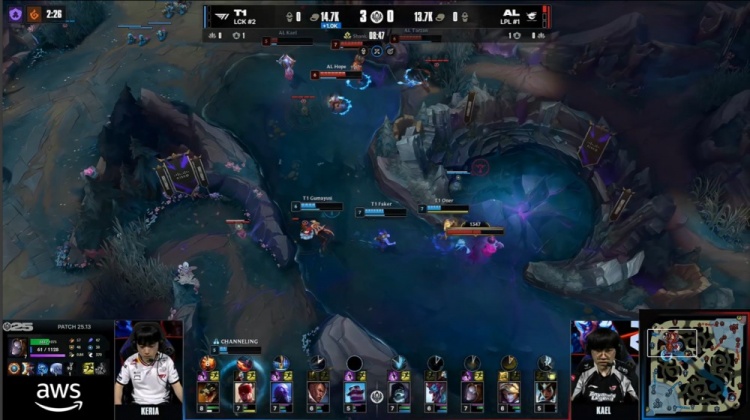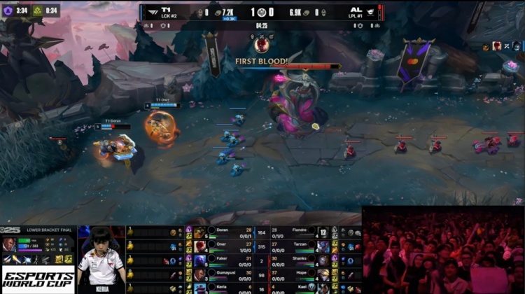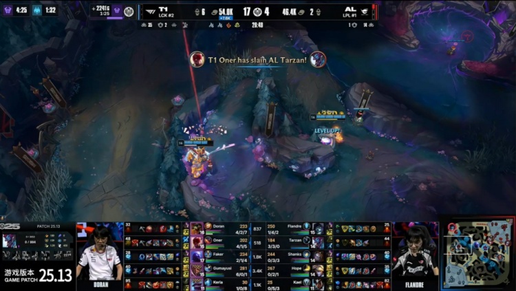【25:01】T1轻松吃掉大龙,中路团战,Keria布隆架盾,Shanks发条大T1四人无济于事,双方拉开。随后T1推掉AL下路二塔,上路多兰与Oner击杀Tarzan,T1经济领先8k。