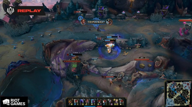 【22:21】AL三人上路抓Faker,后者瑞兹交大逃走,Keria布隆带队上路留住Kael,Oner在回廊将其击杀,T1推掉AL上路二塔并拿到风龙魂,经济领先5k。
