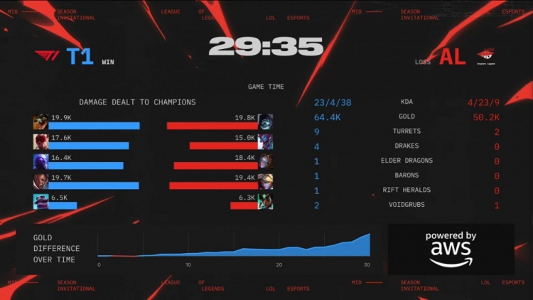 后期T1开厄塔汗,Doran鳄鱼开大进场,Gumayusi卢锡安三杀帮助T1团灭AL。T1拿下风龙魂和大龙后连续推塔。最终远古龙团Keria布隆完美开团,Oner盲僧双杀,T1团灭AL后推平基地扳回一城。