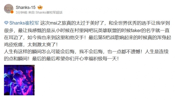 直播吧7月12日讯 在今日的MSI败者组决赛上,AL以2-3的比分不敌T1无缘决赛,赛后中单选手Shanks更新微博:这次msi之旅真的太过于美好了,和全世界优秀的选手让我学到很多,最让我感慨的是从小时候在村里网吧玩英雄联盟的时候faker的名字就一直在耳边了,如今我也来到这里和他交手!最后第5把战歌响起来的时候真的浑身起鸡皮疙瘩,太刺激太爽了!