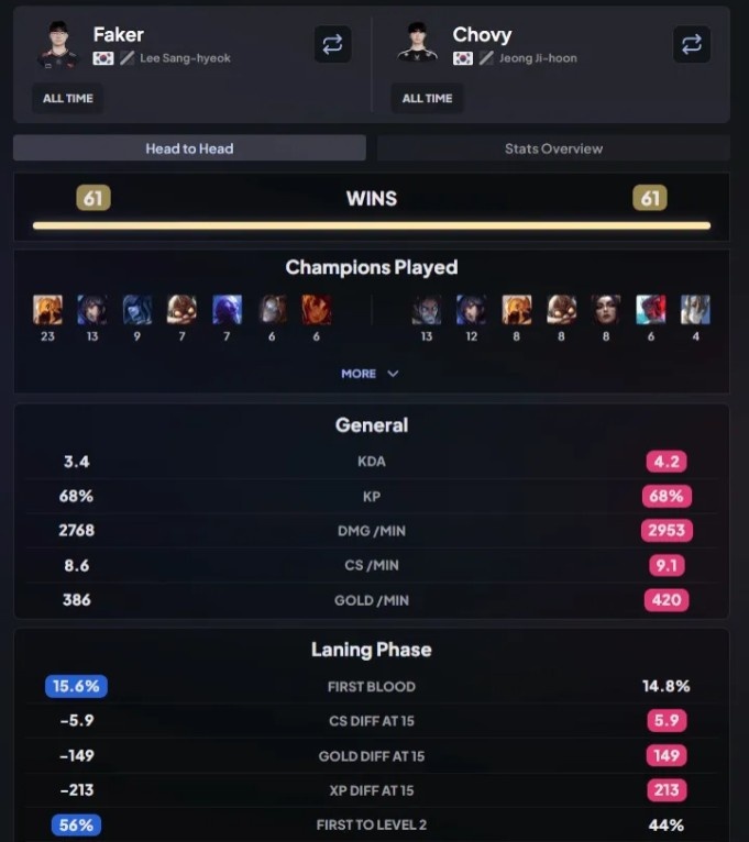 直播吧7月12日讯 2025MSI决赛GEN vs T1将于明早八点开打,这也是Chovy和Faker首次在国际大赛决赛交手,外网数据统计博主发文称,Chovy和Faker交手了122次,Faker赢了61次,Chovy赢了61次,其中一人今晚(加拿大时间)将成为国王。
