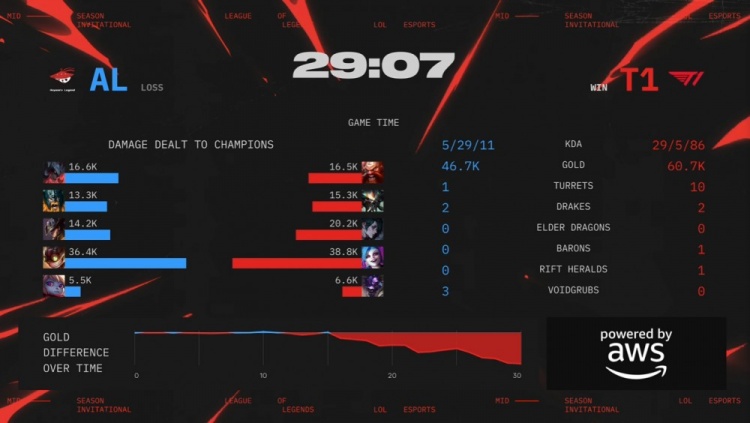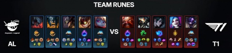 后期下路团战Flandre剑魔率先被秒,小吕布金克丝启动拿下双杀,T1团灭AL将经济差距扩大到8k。野区团战Tarzan奥拉夫开大被集火秒杀,小吕布金克丝再获双杀,T1打出0换4后拿下大龙。最终T1破掉AL两路高地,小吕布金克丝15-0-12完美战绩带领T1推平AL基地赢得比赛胜利。