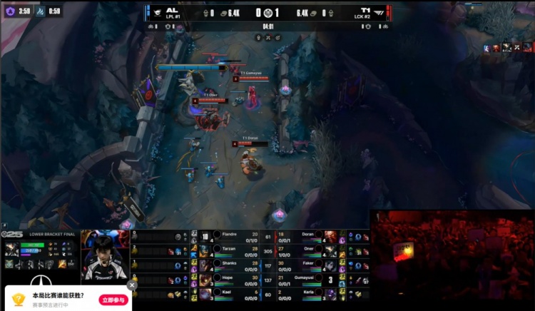【23:39】AL上路找机会,Keria牛头冲锋,AL中野瞬间被杀,Flandre剑魔0伤害送小吕布金克丝启动,AL打出1换2,经济落后7k。