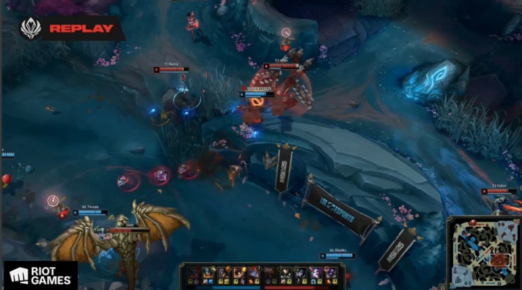 【27:27】T1下路推进拔掉AL水晶后转中破掉AL两路,高地团战,Shanks压到Faker起身,小吕布启动开始收割,战绩锁定在15-0-12,T1推掉AL基地拿到比赛胜利。