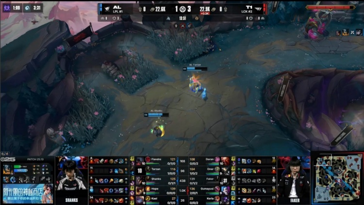【13:46】Shanks卡牌飞上黄牌定住Faker,Tarzan奥拉夫吃掉人头,AL三人来上推掉T1一塔,双方经济持平。