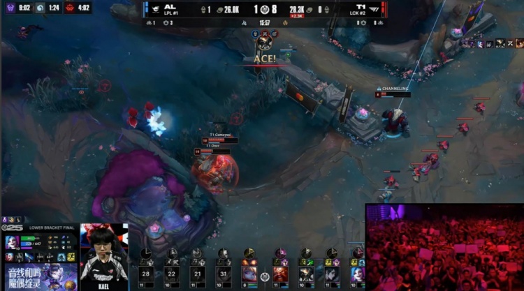 【15:08】先锋团,侧面多兰找Flandre对拼,小吕布吃掉先锋再杀Kael,Faker慧天火融化Shanks后再杀Tarzan拿到双杀,小吕布金克丝启动收割战场,T1打出0换5团灭AL,经济领先3k。