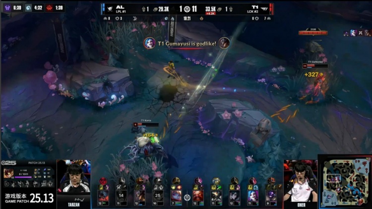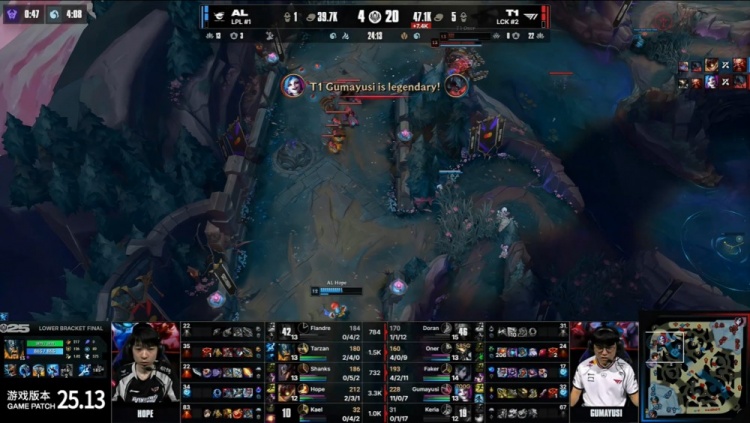决胜局前期Oner蝎子配合Doran酒桶越塔击杀Flandre剑魔拿到一血。小龙团,Oner蝎子隔墙拉回Kael波比,小吕布金克丝完成双杀,T1拿下水龙。Shanks卡牌飞上路黄牌定住Faker慧,Tarzan奥拉夫完成击杀,AL推掉T1上路一塔。