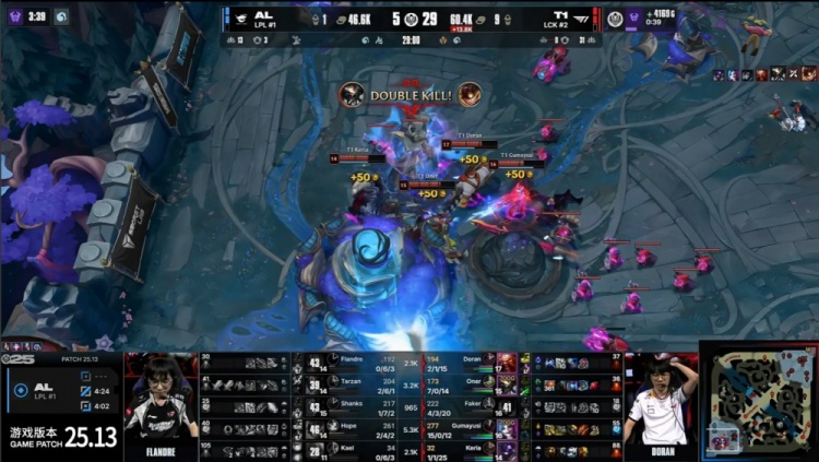 【25:27】野区团战,Tarzan奥拉夫开启大招被T1众人集火秒杀,小吕布启动双杀到手,Keria绕后顶回Shanks卡牌,T1打出0换4,T1推掉AL上路二塔,回头吃掉大龙,经济领先1w1k。