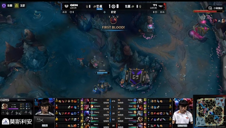 【7:52】下路Kiin塞恩逮到了机会,泥头车+Q直接单杀掉了Gumayusi库奇!拿下一血!