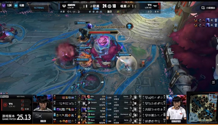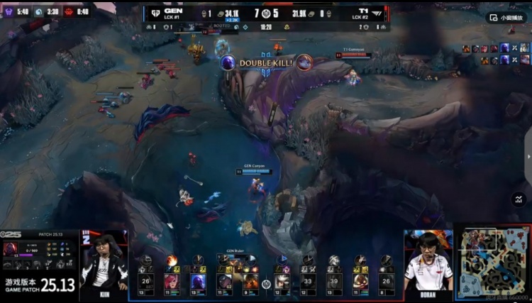 【25:28】GEN大龙逼团,Ruler塞纳禁锢+Kiin塞恩大招秒掉了Oner猴子真身!Keria波比换惩戒没能抢下大龙!自己和Gumayusi库奇一起被GEN留下!Doran青钢影再次绕后再次被抓!GEN拿下大龙+拆掉中二塔!经济优势来到8K!