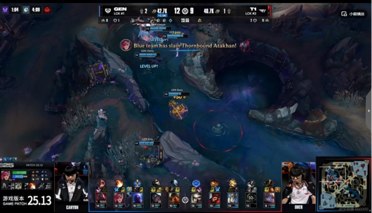 【23:21】中路Faker加里奥被开,Chovy瑞兹绕后配合塞纳大招击杀Gumayusi库奇,拿下荆棘厄塔汗!在对手野区看戏的Doran青钢影还被Canyon蔚大招逮捕了!GEN经济优势来到3K了!