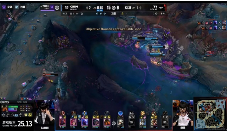 【15:08】中路交战,双方拉扯中Oner猴子转大配合队友强杀Canyon蔚,但是Doran青钢影眼上回城被Duro泰坦闪现过墙钩逮捕!打出一换一但是GEN可以拿下峡谷先锋!