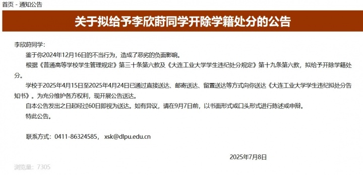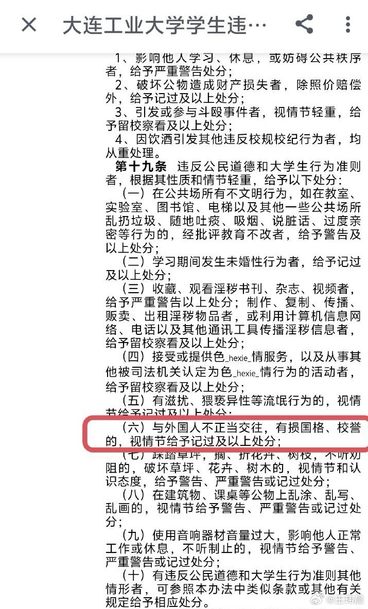 近日大连工业大学学生工作部发布公告,因反校规第十九条第六款:与外国人不正当交往,有损国格、校誉,拟给予李欣莳同学开除学籍处分。